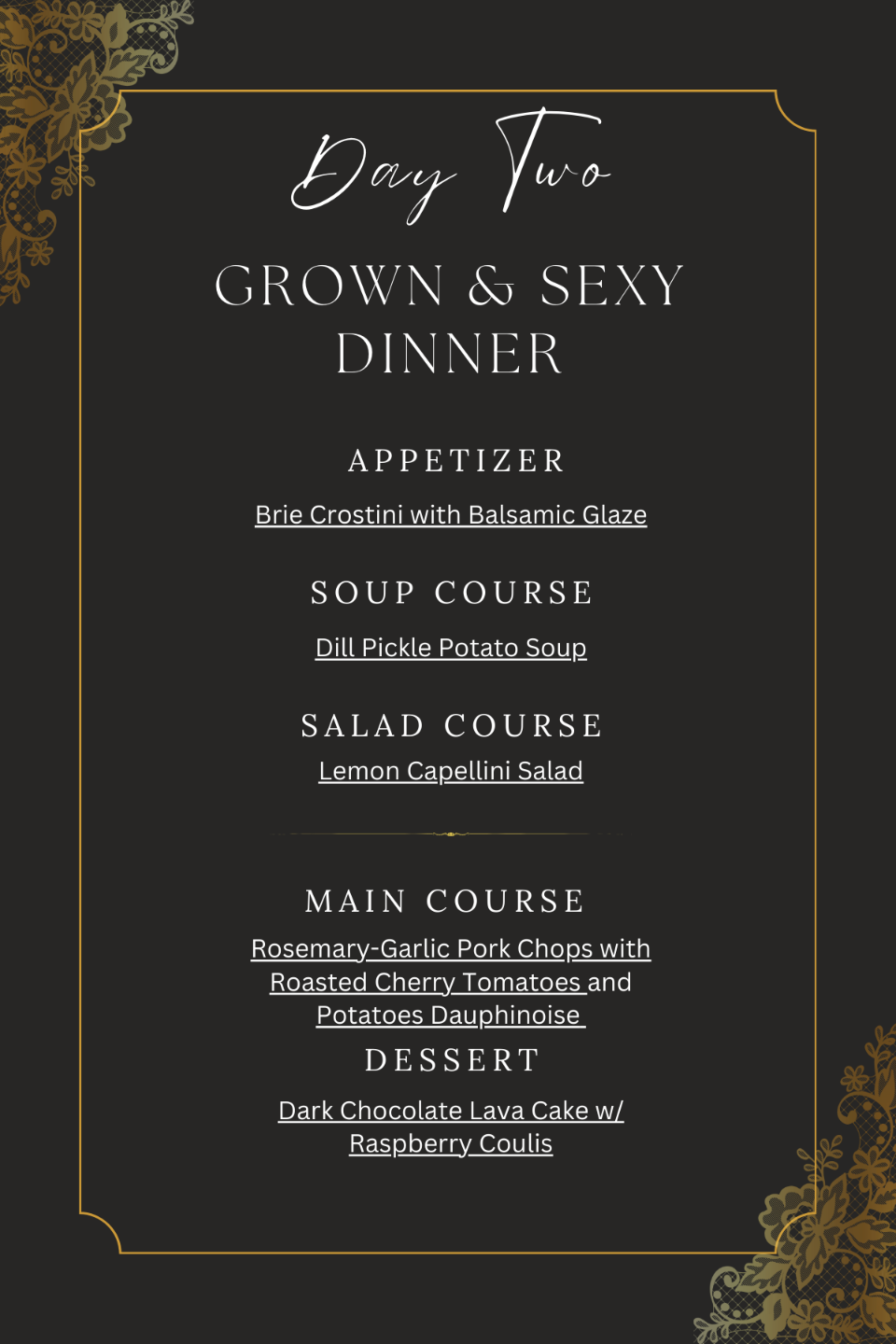 - Saturday: Breakfast, Lunch on-the go, Candlelit Dinner